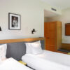 Business class room in the building adjacent to the Palace and connected to it by an underground corridor called Oficyna. The rooms are located on three floors, of which those on the first floor give access to the terrace. Each of the 21 rooms is approximately 20 m2, has a private bathroom, one large double bed (180 x 210 cm) or two single beds (90 x 210 cm) with the possibility of joining into one.