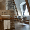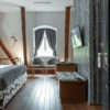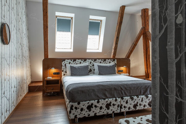 The bed frame in spotted, cow spots and a series of wooden beams are not the only accents referring to the rustic character of this spacious room. A humorous accent in the form of pears growing on a willow on the wallpaper gives the interior a tone of freedom and idyll.
