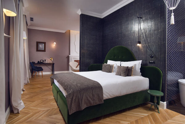 Marble window sills, an originally preserved fireplace and an antique chest of drawers create the atmosphere of a former apartment in a bourgeois tenement house. A wardrobe with an ornate crown, lamps resembling bird cages and subdued colours give the interior an elegant and peaceful tone. The glass wall of the bathroom gives a sense of space, and the wonderful view from the window onto the park completes the atmosphere of relaxation.